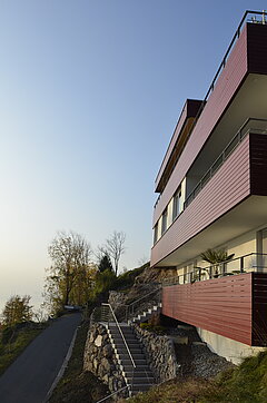 Der kompakte Baukörper wurde optimal den schwierigen topographischen Verhältnissen angepasst.